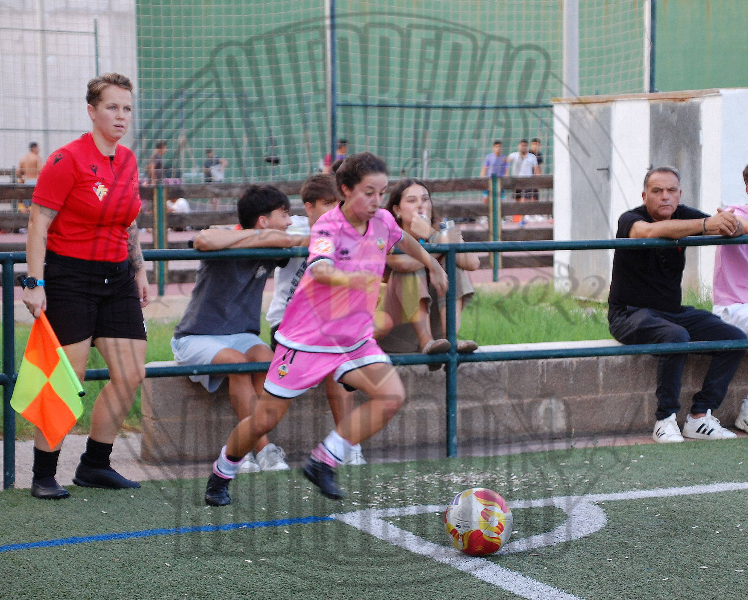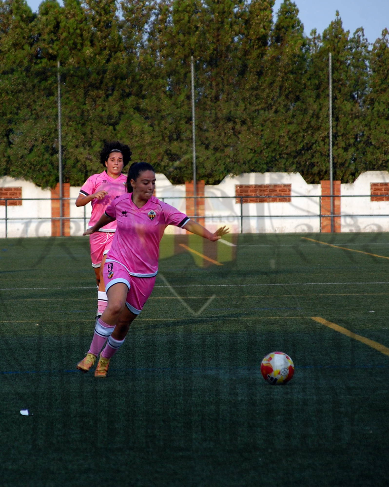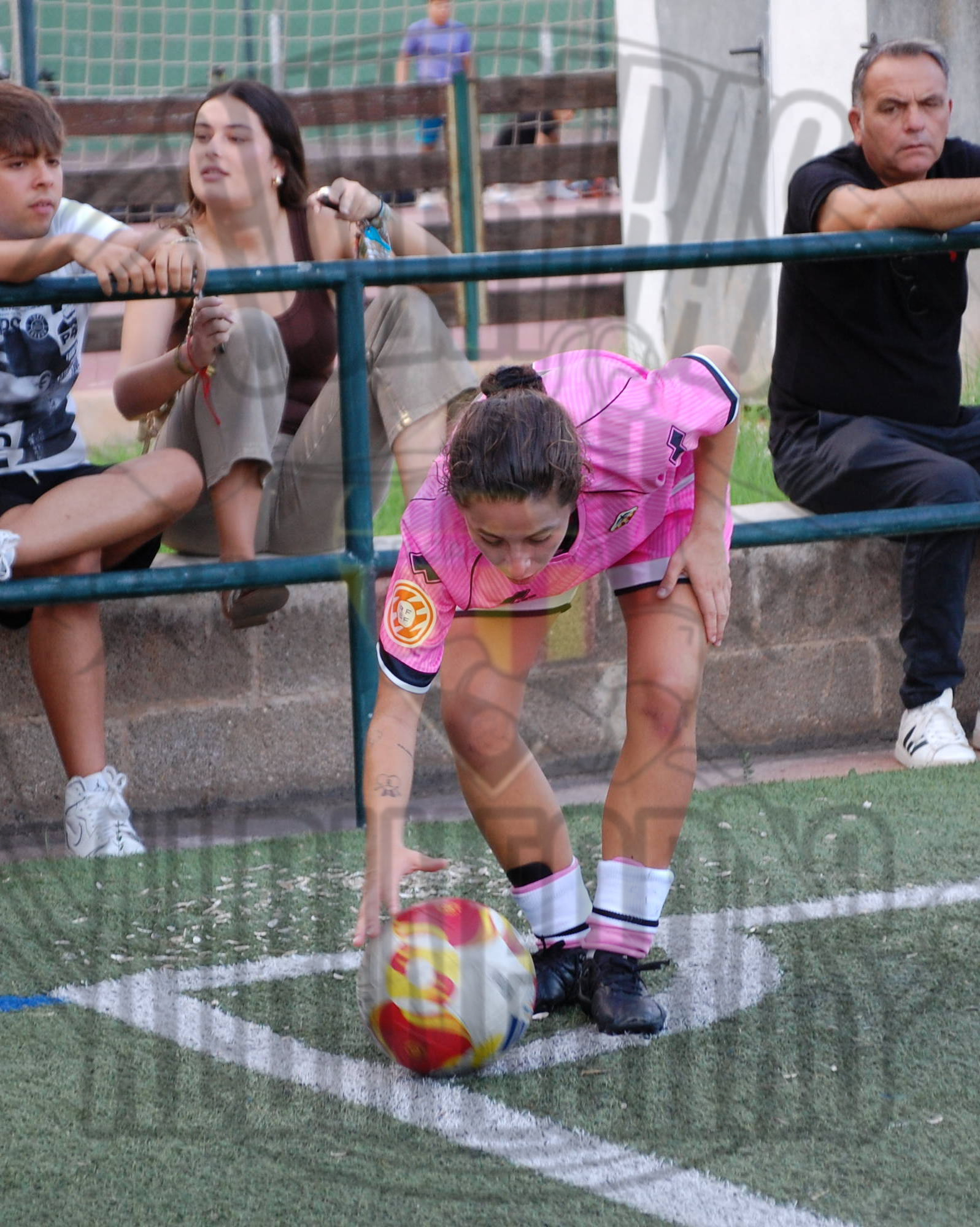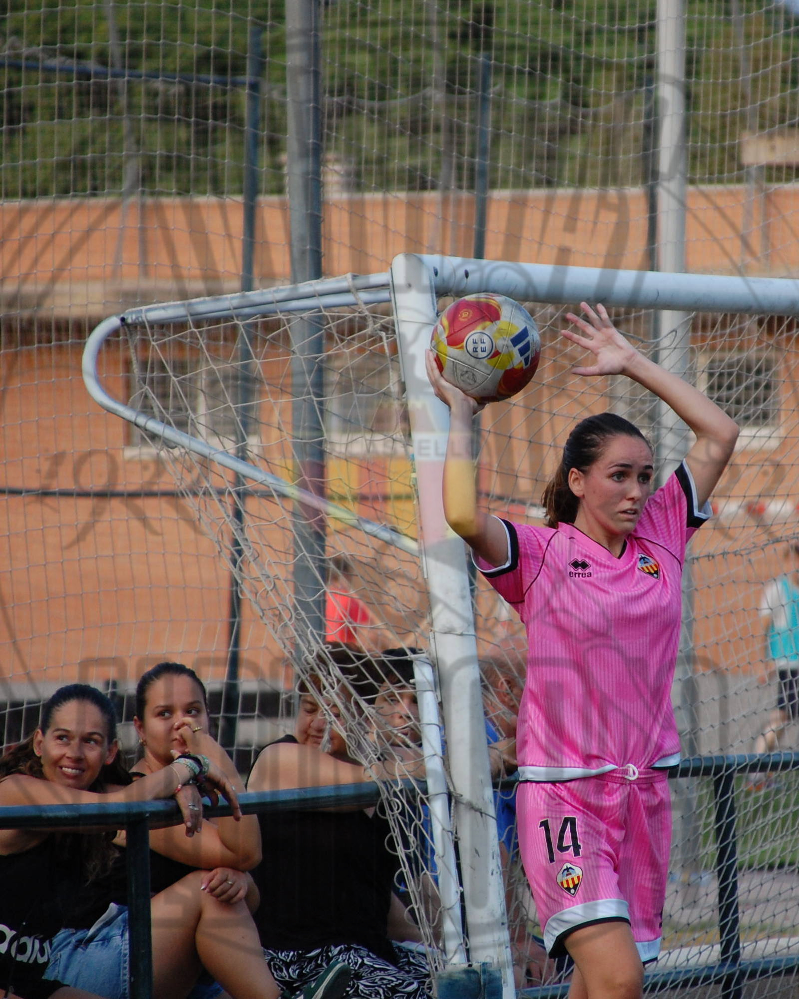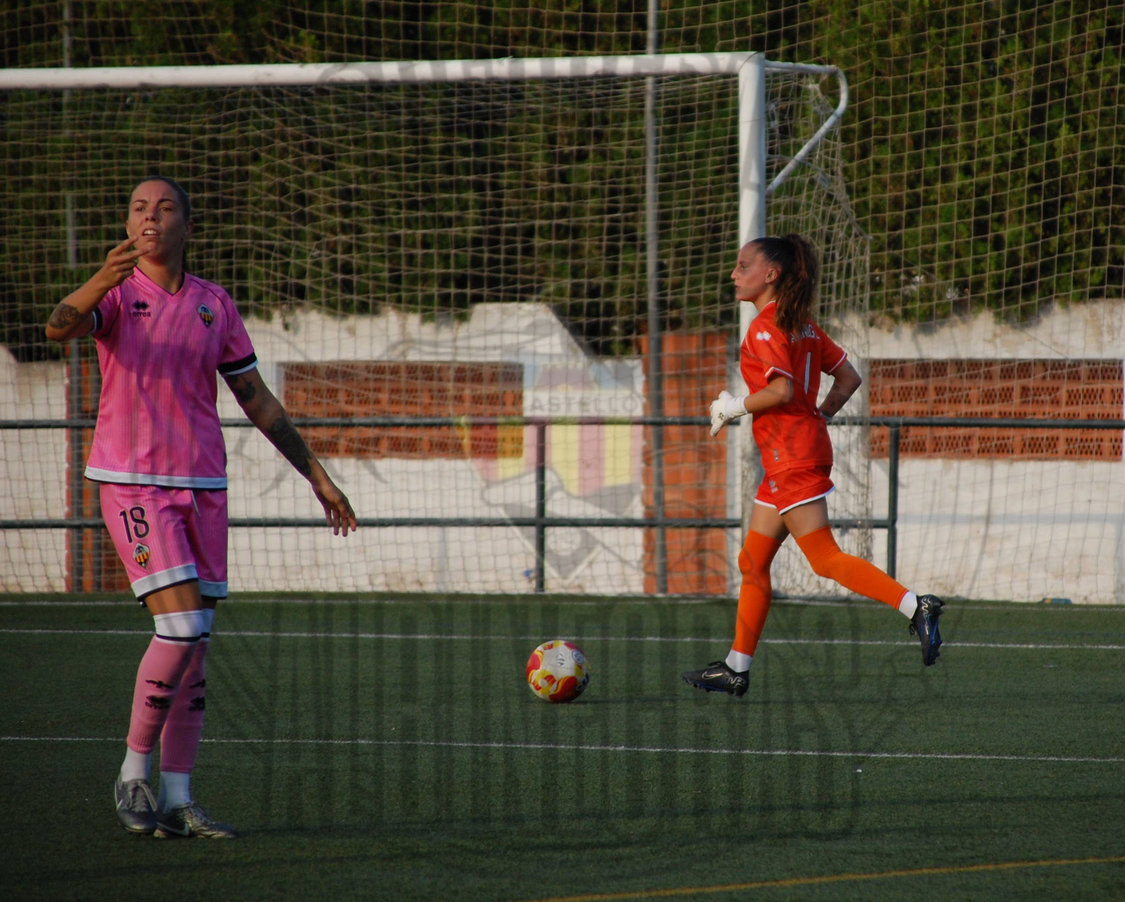 una jugadora grogueta el balón se queda muerto en el borde del área y Soler es objeto de falta,